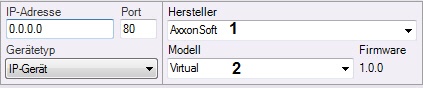 - Fügen Sie mit Hilfe des Suchmasters für IP-Geräte die Kamera hinzu, und wählen Sie im Feld Hersteller AxxonSoft (1, vgl. Erstellen und Entfernen von IP-Geräten).