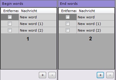 - In der Gruppe Begin words (1) werden die Wörter eingegeben, die den Beginn des Bons definieren. Um Wörter hinzuzufügen, klicken Sie auf die +, um sie zu entfernen, aktivieren Sie das entsprechende Kontrollkästchen Entfernen, und klicken Sie auf -.