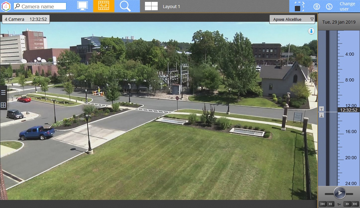 - Playback control panel. Archive navigation via the playback panel in the web client is the same as when working in the Axxon Next client (see Navigating Using the Playback Panel).