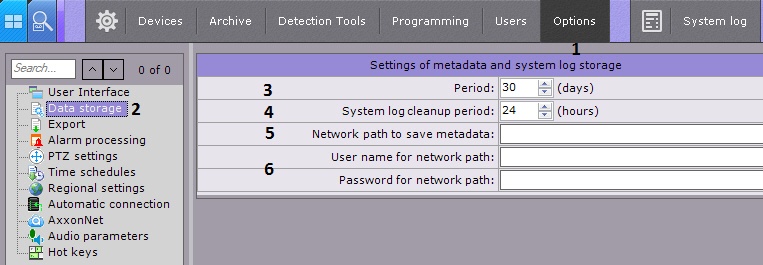 In the Period field, enter the amount of days to store the system log in the Server’s database and to store metadata in the object trajectory database (3). The maximum time is 1000 days.