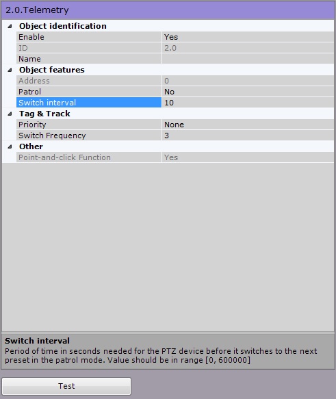 To check the functioning of the PTZ device, click the Test button. If the PTZ device is configured correctly, it will turn one step and return to its original position.