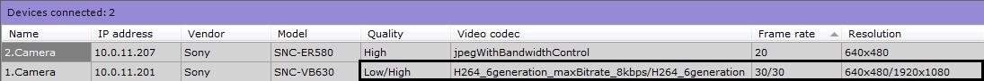 If a camera supports multistreaming, the information in the QualityVideo codec, Frame rate and Resolution  columns will be displayed as follows> value for the lowest-quality stream/value for the highest-quality stream.