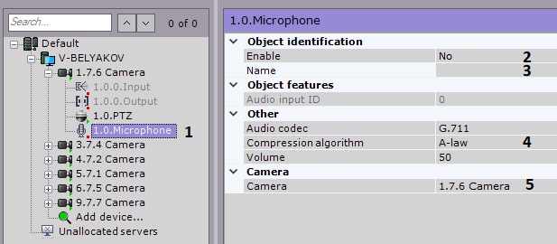 If a microphone is part of an IP server, then you must specify the video camera to which it will be linked in the settings of the given microphone. When you do this, the Microphone object will become a child of the specified Camera object.