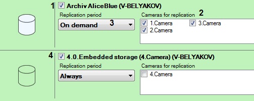 2. Select one or more archives form which you want to copy data (1).  You can also replicate video from on-board camera storage (4, see The Embedded Storage object)