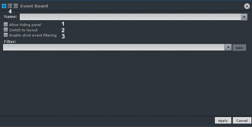 button.By default, some events on the Event board come with audit events. If no display of audit events is required, select the Enables strict messages filtering checkbox (3).