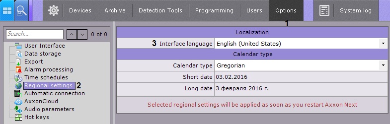 The newly selected interface language will be applied once Axxon Next is restarted.