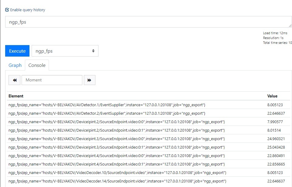 Filtering by any of the parameters. For example, a query like ngp_fps{ep_name=~"hosts/V-BELYAKOV/DeviceIpint.2/SourceEndpoint.video:0:0"} will return fps values only for the specified source.