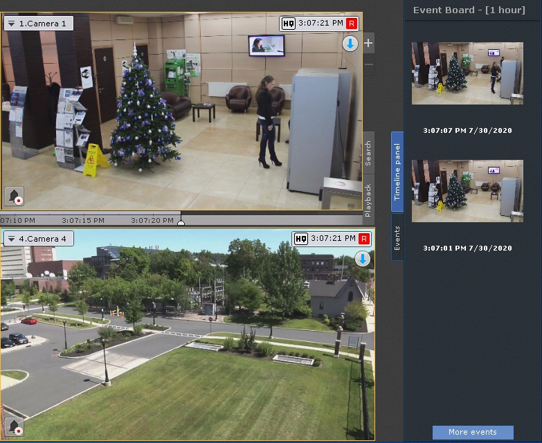 Click the Events button on the right margin of the screen. An events panel (see Working with Events Boards) opens containing detection tool triggering events for this camera only.
