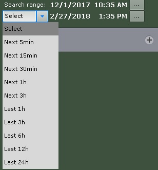 Next 5min /15min /30min /1h /3h | The searches will be performed within the following interval: [specified start of the interval; specified start of the interval + 5min / 15min / 30min / 1h / 3h]. To set the beginning time of the interval, click . |