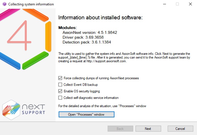The Support.exe utility is located in the folder <Axxon Next installation directory>\AxxonNext\bin