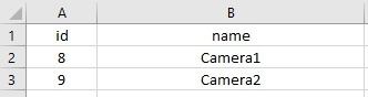 - Create an Excel file containing two columns: the id column for camera IDs and the name column for camera names.