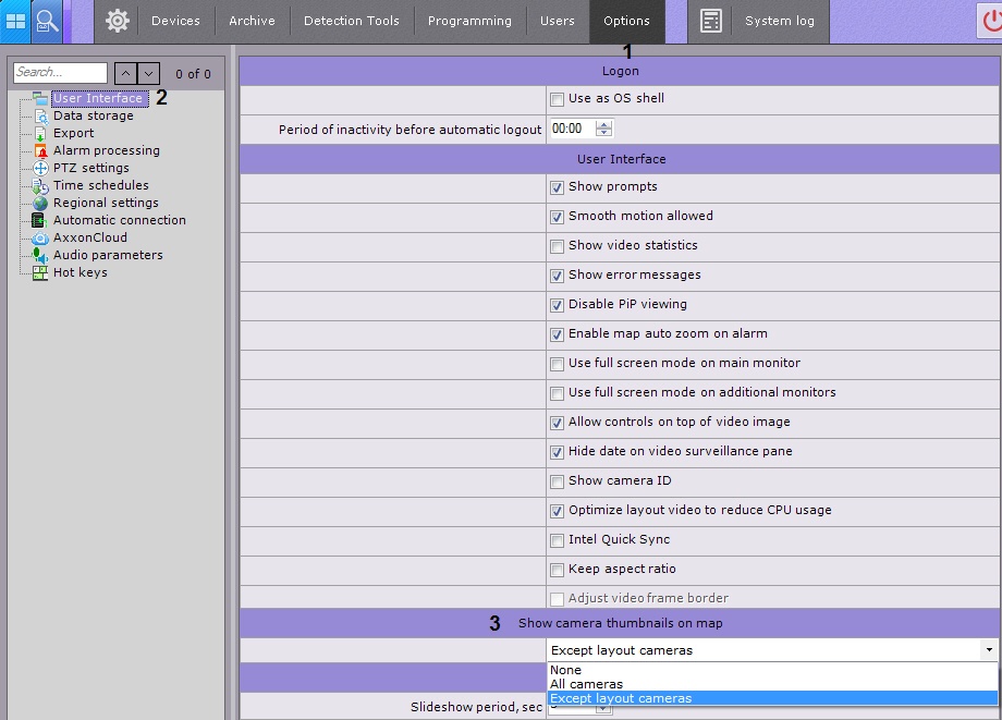 By default, the map shows video (see Configuring a camera in standard map viewing mode) only from cameras that are not on the current layout.