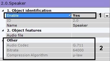 By default, IP device speakers are disabled. To enable, for the Enable value (1), select Yes. When configuring the speaker of an IP device, you can set other parameters as well, such as the compression algorithm for the audio signal sent to the speaker for playback (2). Which speaker parameters you can configure is determined by the protocol for integration of the IP device and the Axxon Next software package.
