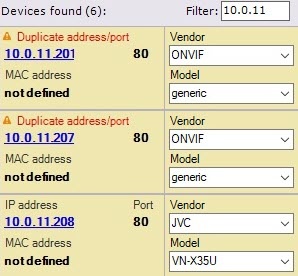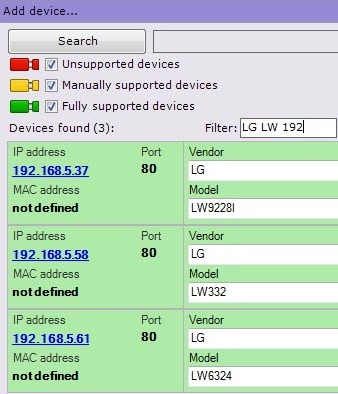 - By manufacturer, model or IP address. To do this, use the Filter field. For example, this filters the LG devices, the name of which contains the LW model and whose IP address contains 192.