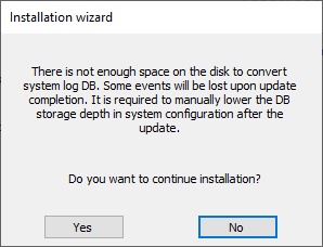 Click Yes to continue the installation. After installation, you need to adjust the database storage settings or increase the free space on disk (see Configuring storage of the system log and metadata).Attention!
