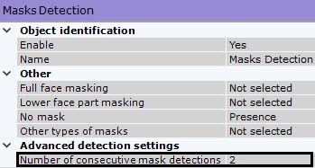 - In the Number of consecutive mask detections field, set the minimum number of frames in which the detection tool should detect a mask in order to trigger.