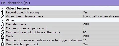 - By default, a detection tool trigger for each item of equipment will be generated once within the existence of a person's track. If it is necessary to generate a trigger for each equipment violation, then select No in the One detection per track parameter (8).