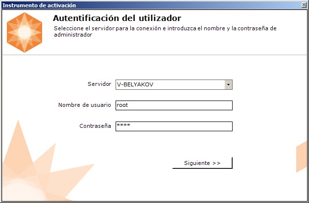 Luego se deberá elegir el nombre de uno de los Servidores del Axxon-dominio para el que se difundirá el fichero de licencia (este fichero se difundirá a todos los Servidores activados en el momento de la activación de este Axxon-dominio) y conectarse al sistema utilizando el nombre y contraseña del administrador del paquete de software Axxon Next para continuar con el proceso de activación.