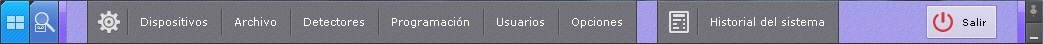 Durante la configuración del sistema, el panel superior contiene las pestañas con los diferentes grupos de configuraciones, el botón de paso al historial del sistema, el nombre de usuario conectado al Cliente, y el botón de salida.