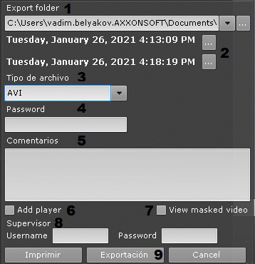 - Si el formato de exportación es MKW o AVI y necesita añadir la utilidad Axxon Player a la carpeta con la grabación de vídeo exportada, marque la casilla correspondiente (6).