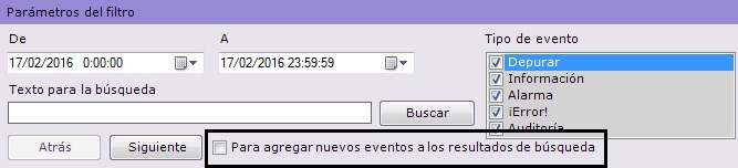 Existe la posibilidad de actualizar la tabla de resultados de búsqueda de eventos, o sea, añadir a ésta eventos, que tuvieron lugar después de iniciarse la búsqueda (véase la sección Procedimiento de búsqueda). Para realizar esta posibilidad será necesario poner el marcador Agregar nuevos eventos en los resultados de búsqueda.