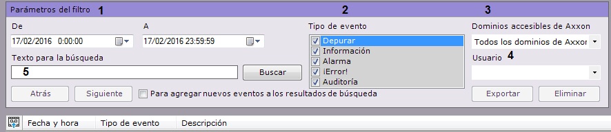 En los campos De y A (1) ingrese la fecha y la hora del inicio y final del periodo de tiempo durante el cual fueron registrados los eventos buscados.