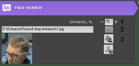 - Introduzca el nivel de parecido mínimo (porcentaje) del rostro en la imagen seleccionada con los rostros del archivo (1). En los resultados de la búsqueda, aparecerán solamente aquellas grabaciones de vídeo que contengan imágenes de facciones con un nivel de parecido superior al especificado.