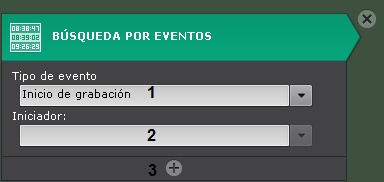El iniciador del evento puede ser el operador, el sensor de la videocámara y cualquier detector activado en el sistema. Los resultados de la búsqueda serán los momentos en el archivo que contengan los eventos activados por el iniciador.
