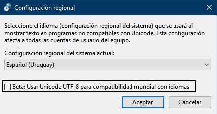 - Desmarcar Versión beta: Utilizar Unicode (UTF-8) para ser compatible con todos los idiomas.