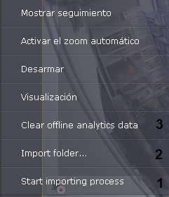 Si se establece el periodo de replicación A petición (véase Configuración de la replicación de datos), para el inicio del proceso de indexación se debe seleccionar la opción Iniciar el proceso de importación (1) en el menú contextual de la ventana de videovigilancia.