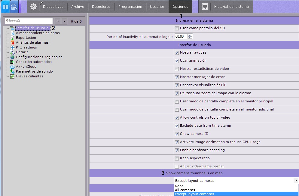 Existe la posibilidad de visualizar la imagen de vídeo en el mapa para todas las videocámaras sin excepción, o bien desactivarla por completo: