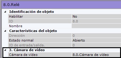 El objeto Relé se muestra automáticamente en el árbol de objetos como afiliado del objeto Camera de vídeo, si  la cámara de vídeo tiene una salida incorporada o una salida discreta conectada. La cantidad de objetos Relé para la videocámara corresponde a la cantidad de salidas digitales que posea.