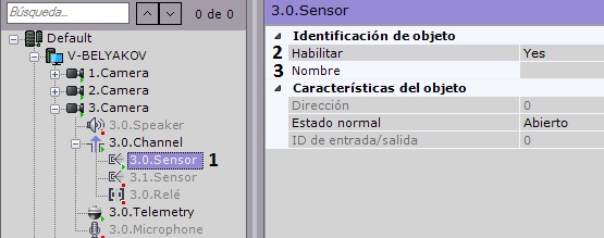 El objeto Sensor se muestra en el árbol de objetos como afiliado del objeto de la Cámara de vídeo, si la cámara de vídeo tiene una entrada incorporada o una entrada discreta conectada. La cantidad de objetos Sensor para la videocámara corresponde a la cantidad de entradas digitales que posea.