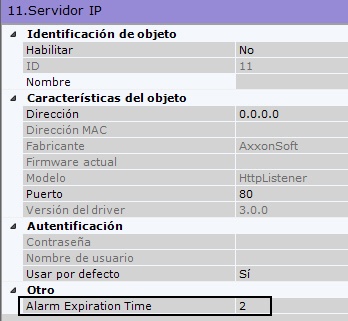 La configuración de los sensores virtuales es similar a los reales, además, para cada objeto Servidor IP en el campo Alarm ExpirationTime se especifica el período de tiempo en segundos después del cual el estado del sensor se restablecerá automáticamente.