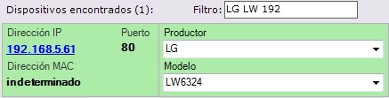 - Según el fabricante, el modelo del dispositivo y la dirección IP. Para ello, se utiliza el campo Filtro. Por ejemplo, este filtro dejará entre los resultados de búsqueda los dispositivos LG, cuyo nombre de modelo contiene LW y cuya dirección IP contiene 192.