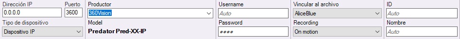 Dirección IP, Puerto, Fabricante, Modelo, Nombre de usuario, Contraseña, ID, Nombre del objeto, Latitud, longitud, Acimut, Nombre del archivo, Modo de grabación