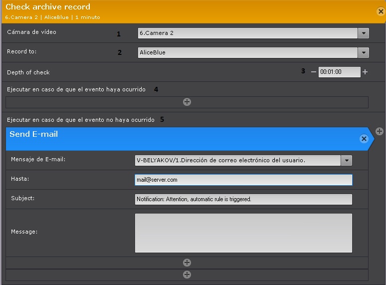 Si se selecciona la notificación por correo electrónico o mensaje SMS como reacción, las cámaras de vídeo de destino se indicarán en el mensaje (si se seleccionó un grupo de cámaras) para lo cual no hay entradas en el archivo para el período especificado.
