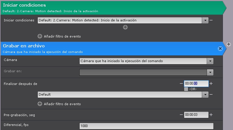 Ejemplo 2. Todas las cámaras de vídeo del Axxon-dominio Default se graban constantemente con el archivo (video grabado) con decimación. Para que por la detención (momentos del disparo) de los detectores de movimiento se realice la grabación a la máxima frecuencia de cuadros, es necesario configurar el siguiente macro comando: