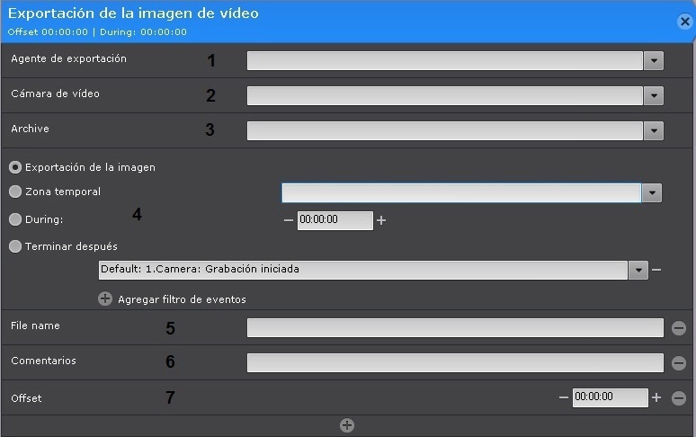 - Agente de exportación (1) - Seleccione el Servidor (también conocido como objecto Agente de exportación) adonde desea exportar la grabación de vídeo (véase Configuración del agente de exportación).