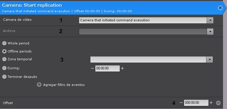 5. Si desea especificar un Desplazamiento (4), si especificó una Duración para la replicación. En este caso será copiado un fragmento de grabación durante el período [hora de inicio de la acción - desplazamiento; hora de inicio de la acción + duración - desplazamiento].