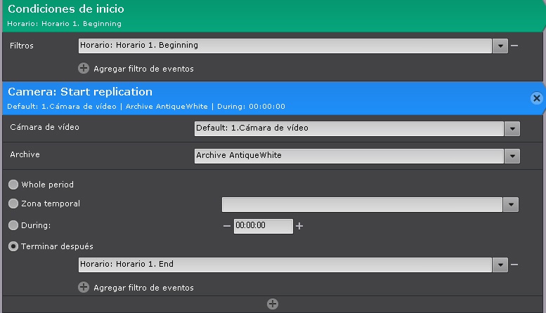 Es necesario seleccionar uno o varios eventos finalizados. Todas las grabaciones de vídeo entre el punto de inicio (cuando se inicia la acción) y el punto final (cuando se recibe el evento) se copiarán.  ¡Atención! La replicación no se iniciará hasta que no se reciba el evento finalizado.