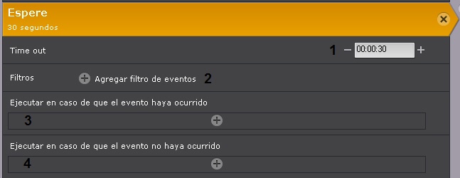 - Si es necesario, seleccione y configure la acción que se desee realizar si alguno de los eventos establecidos en el filtro, no ocurrió durante el tiempo de espera (4). Entre las acciones puede estar el nuevo comando Espera.