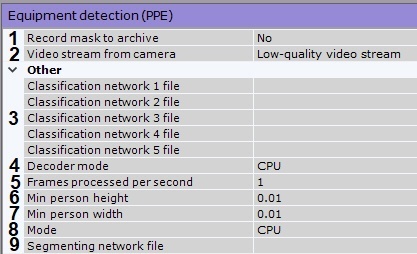 10. Por defecto, la activación del detector para cada elemento del equipo se generará una vez dentro de los límites de la existencia de la pista del individuo. Si se requiere generar una activación cada vez que se detecte una violación del EPI, es necesario seleccionar No para el parámetro One Event per Equipment Element (12).