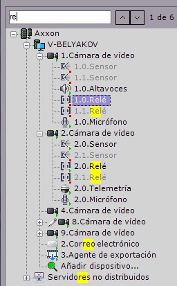 Axxon Next le permite buscar objetos en el árbol de objetos utilizando sólo una parte de su nombre o la dirección IP.. La búsqueda se realiza en todas las pestañas del submenú del Dispositivos.