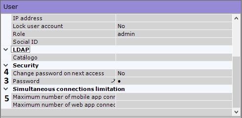 Si desea limitar el número de conexiones para un usuario a través de clientes Web o móviles, haga lo siguiente: especifique un número máximo de conexiones (5). Además, el parámetro Número máximo de conexiones web también define el número máximo de solicitudes de flujo rtsp por usuario.