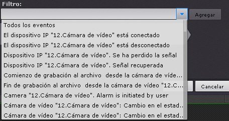 Para añadir eventos del mismo tipo de diversos dispositivos, introduzca el texto para este evento en el campo Filtro. Seguidamente, en la lista de eventos estarán disponibles solo los eventos del tipo especificado. Para volver a la lista completa de eventos, seleccione un evento cualquiera y borre la línea del filtro.