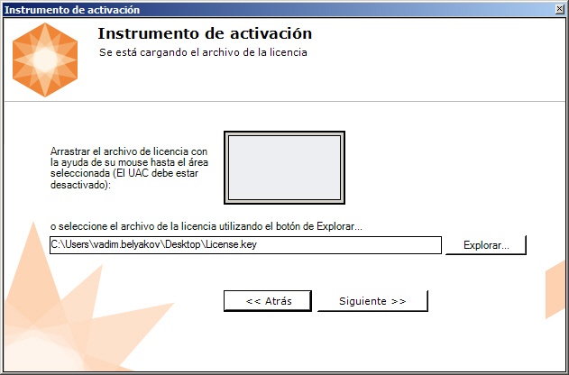 - Traslade el fichero de licencia al área seleccionada (1).