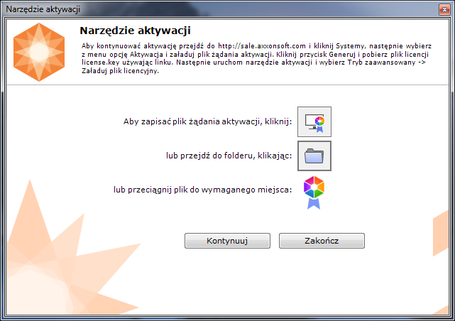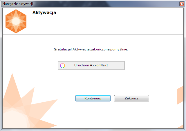 Kliknij przycisk Kontynuuj, aby powrócić do strony głównej narzędzia aktywacyjnego. Aby zakończyć, kliknij przycisk Zakończ. Aby zamknąć narzędzie i uruchomić klienta Axxon Next, kliknij Uruchom Axxon Next.