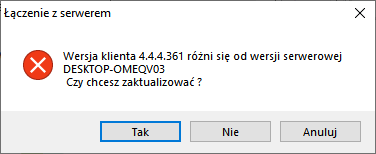 Jeśli wersja Serwera jest wyższa od wersji Klienta, wyświetlone zostanie zapytanie o automatyczną aktualizację Klienta.