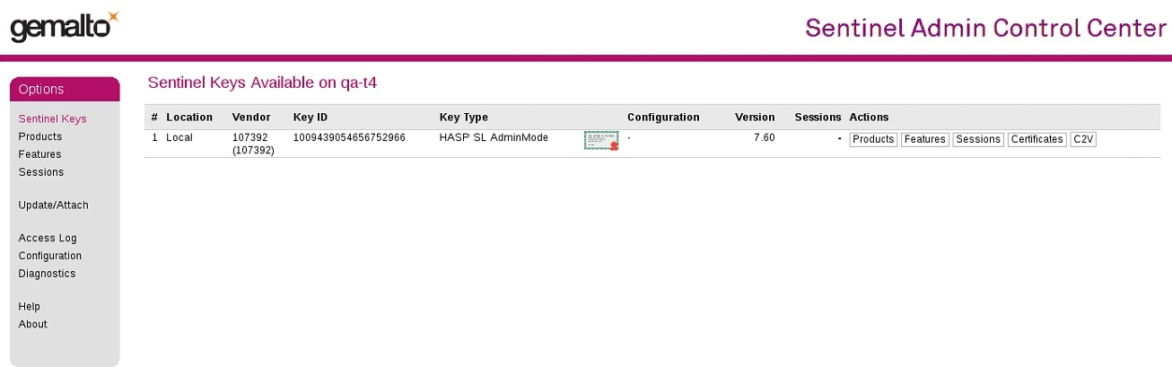 Jako rezultat, zainstalowany klucz będzie wyświetlony pod adresem http://127.0.0.1:1947/ w aplikacji Web Sentinel Admin Control Center.